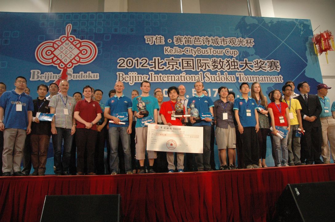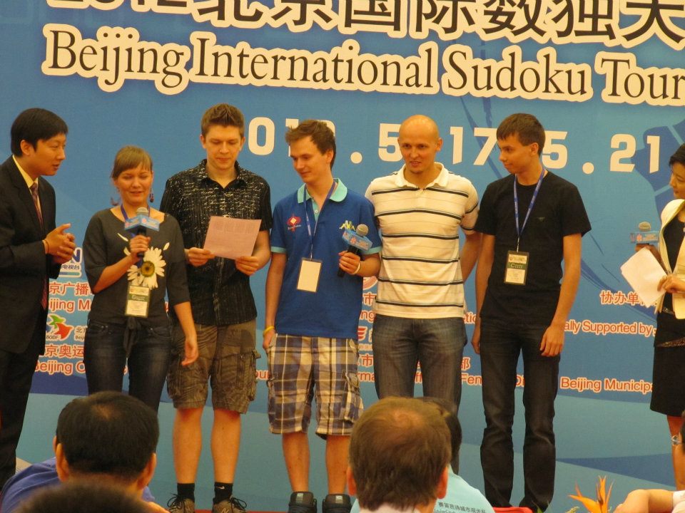 Ponieważ sztab organizacyjny zawodów chyba przewyższał pod względem liczebności samych uczestników, sprawdzanie zadań poszło stosunkowo szybko. W dziesięcioosobowym półfinale znalazł się oczywiście nasz mistrz Janek. Niestety bardzo niewiele zabrakło, żeby towarzyszył mu także Przemek... Pozostało nam mocno trzymać kciuki za Janka! Do ścisłego finału, który miał odbyć się po południu awansowały tylko dwie osoby. Jaka była nasza radość jak Janek oddał zadania półfinałowe 10 minut przed następnym zawodnikiem! Niestety, jak się później okazało, prosta zamiana dwóch cyfr kosztowała go utratę miejsca w finale i spadek na czwarte miejsce w klasyfikacji generalnej. W zapowiadanym po każdych wiadomościach wieczornych, transmitowanym na żywo na kanale sportowym finale zawodów, udział wzięli Kuba Ondrousek oraz Kota Morinishi. Komentarz dla telewidzów i dla nas zgromadzonych na widowni przygotowali autorzy zadań, Chen Cen oraz Wei-Hwa Huang. Po kilku emocjonujących zwrotach akcji, nowym Mistrzem Pekinu w Sudoku został Kota Morinishi, przed zeszłorocznym triumfatorem, Kubą Ondrouskiem.